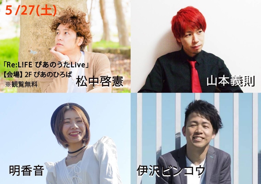Re:L!FE ぴあのうたLive Schedule 2023/05/27(土) 11:30 - エコールリラ 地図を表示 日 付: 2023年5月27日(土) 会 場: 岡場エコールリラ(兵庫) 2Fぴあのひろば 時 刻: 1st. 11:30~/2nd. 14:00~出 演: 伊沢ビンコウ/松中啓憲/山本義則/明香音 料 金: 観覧無料 ⭐︎グランドピアノでフリーライブ!是非お越しくださいませ◎ 会場公式サイト URLをコピーする 報告する
