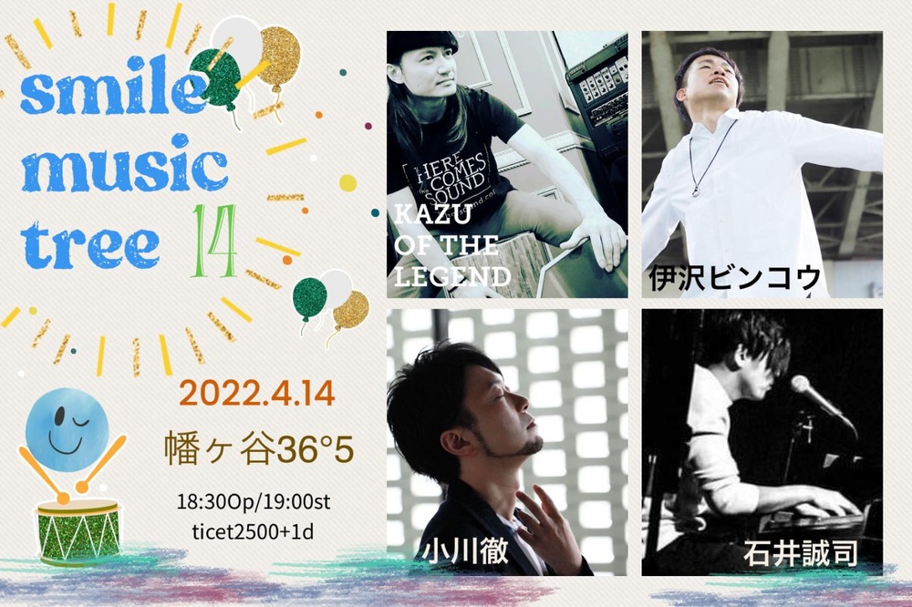 smile music tree vol.14 Schedule 2022/04/14(木) 19:00 - 幡ヶ谷36°5 地図を表示 『smile music tree vol.14』 日 時: 2021年4月14日(木)時 間: 開場:18:30/開演19:00会 場: 幡ヶ谷36°5出 演: 伊沢ビンコウ/小川徹/石井誠司ホスト: KAZU OF THE LEGEND(Perc.) 料 金: 2,500円(+1drink 600円)予 約: 予約フォーム座 席: 全自由席受 付: 各出演者入 場: 当日店頭整列順 チケットのご予約はこちら URLをコピーする 報告する