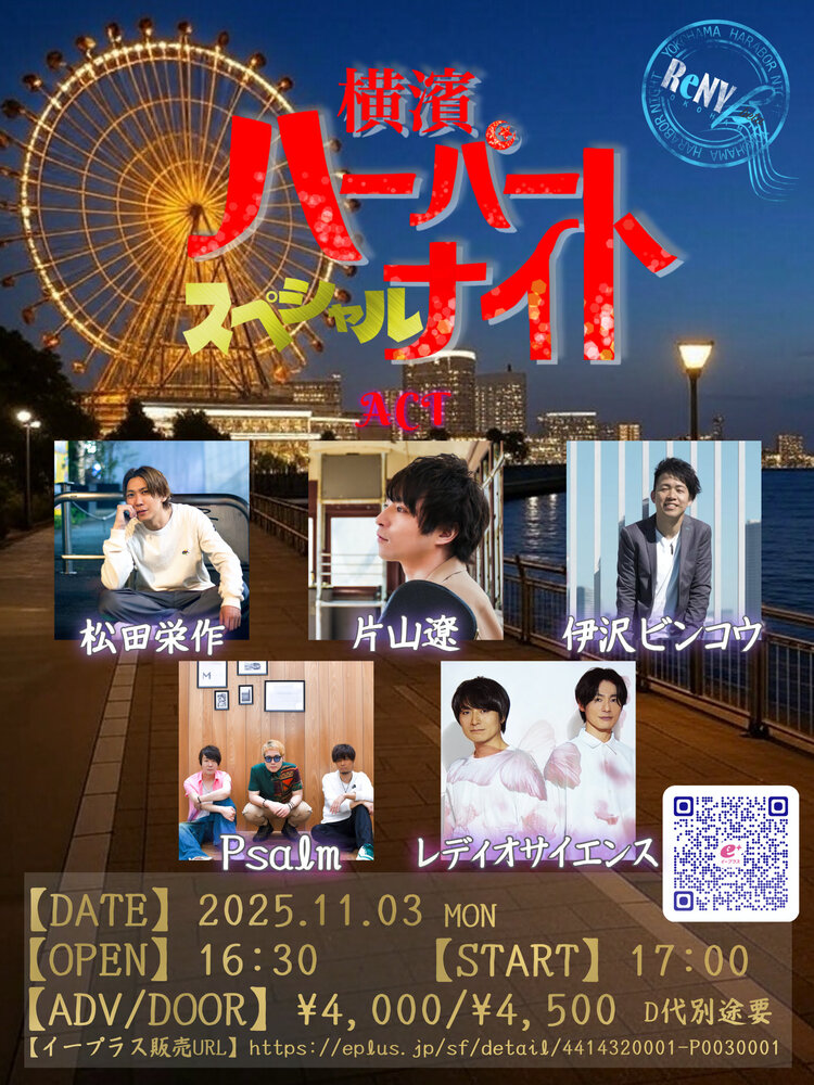 横濱ハーバースペシャルナイト Schedule 2025/11/03(月) 17:00 - 横浜 ReNYβ 「横濱ハーバースペシャルナイト」 日 付: 2025年11月3日(月祝) 会 場: 横浜 ReNYβ 時 刻: 開場16:30 / 開演17:00出 演: 伊沢ビンコウ/レディオサイエンス/松田栄作/片山遼/Psalm料 金: 前売4,000-/当日4,500-(+オーダー) 購 入: e+(10/5(日)10:00〜)/TiGET予約 入 場: e+>TiGET予約>当日 問合せ: 横浜ReNY beta 045-225-8650 チケットを購入する(e+) URLをコピーする 報告する