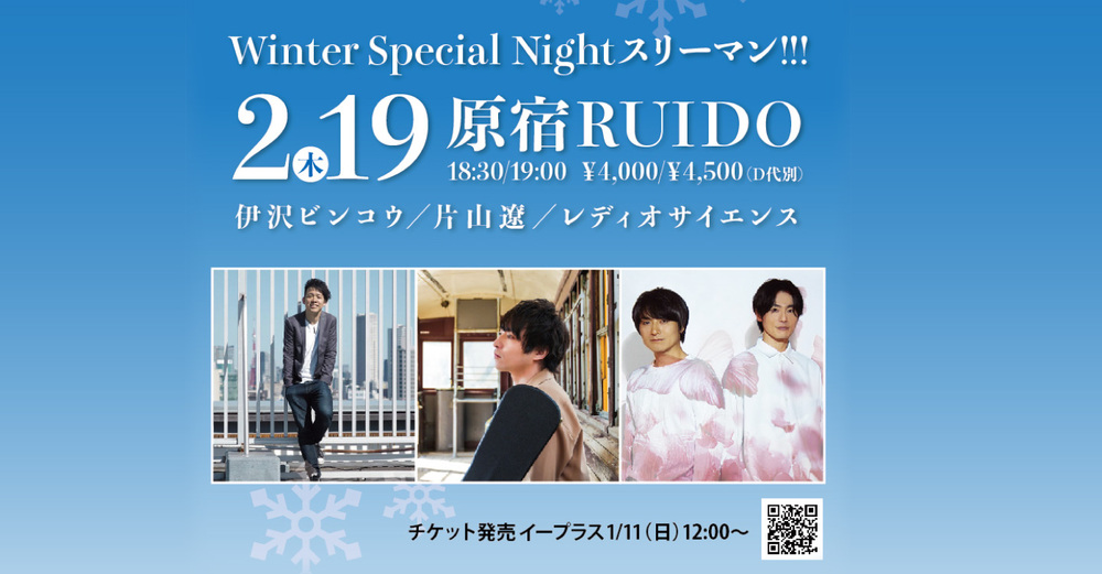 Winter Special Night スリーマン!!! Schedule 2026/02/19(木) 19:00 - 「Winter Special Night スリーマン!!!」 日 時: 2026年2月19日(木) 時 刻: 開場18:30/開演19:00 会 場: 原宿RUIDO 料 金: 予約 4,000円/当日 4,500円(各ドリンク代別) 出 演: 伊沢ビンコウ/片山遼/レディオサイエンス 配 券: 購入サイト(e+)/予約サイト(TiGET)/SNS DM 入 場: e+整理番号順→アーティスト予約→当日券 ※規定枚数に達し次第終了 問合せ: 原宿RUIDO 03-6447-5567 チケットを購入する URLをコピーする 報告する