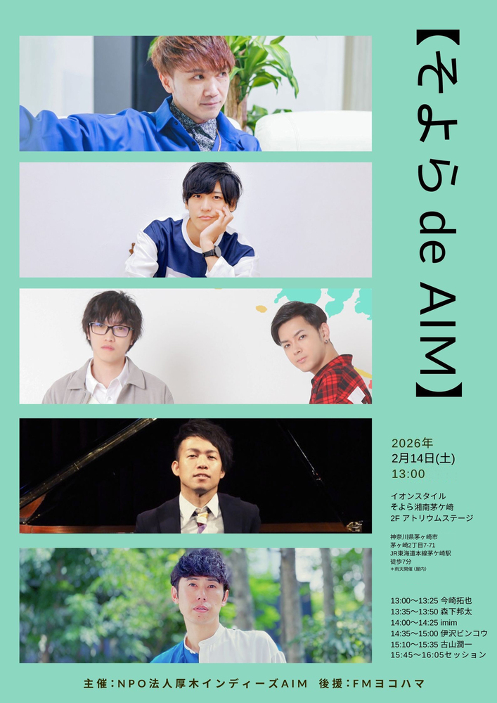 そよら DE AIM Schedule 2026/02/14(土) 13:00 - 厚木インディーズ Presents「そよら DE AIM」」 日 付: 2026年2月14日(土) 会 場: そよら湘南茅ヶ崎 2Fアトリウムステージ 時 刻: 13:00~ 出 演: 伊沢ビンコウ/古山潤一/今崎拓也/imim/森下邦太 料 金: 観覧無料主 催: A.I.M. ※雨天開催・荒天中止 会場公式サイト URLをコピーする 報告する